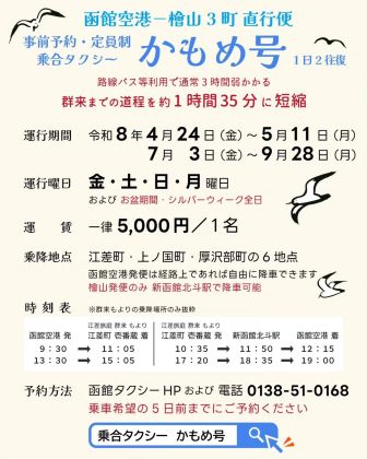 Reservations are now open for the "Kamome-go" direct shared taxi service connecting Hakodate Airport and the three towns of Hiyama.This year, the service has been enhanced with new features, including operation during the "Spring Sightseeing Season" and the addition of a drop-off point at "Shin-Hakodate-Hokuto Station" (Hiyama departures only)!