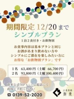 【12月20日までの期間限定】お得なシンプルプラン~1泊2食付・お飲物別プラン