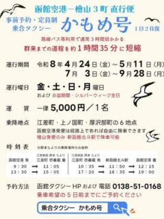 函館空港-檜山3町 直行便「かもめ号」予約受付開始~事前予約・定員制 乗合タクシー Reservations now open for the “Kamome” direct flight between Hakodate Airport and the three towns of Hiyama.函館空港-檜山3町を結ぶ直行便 乗合タクシー「かもめ号」の予約受付が始まりました。 今年は「春の行…